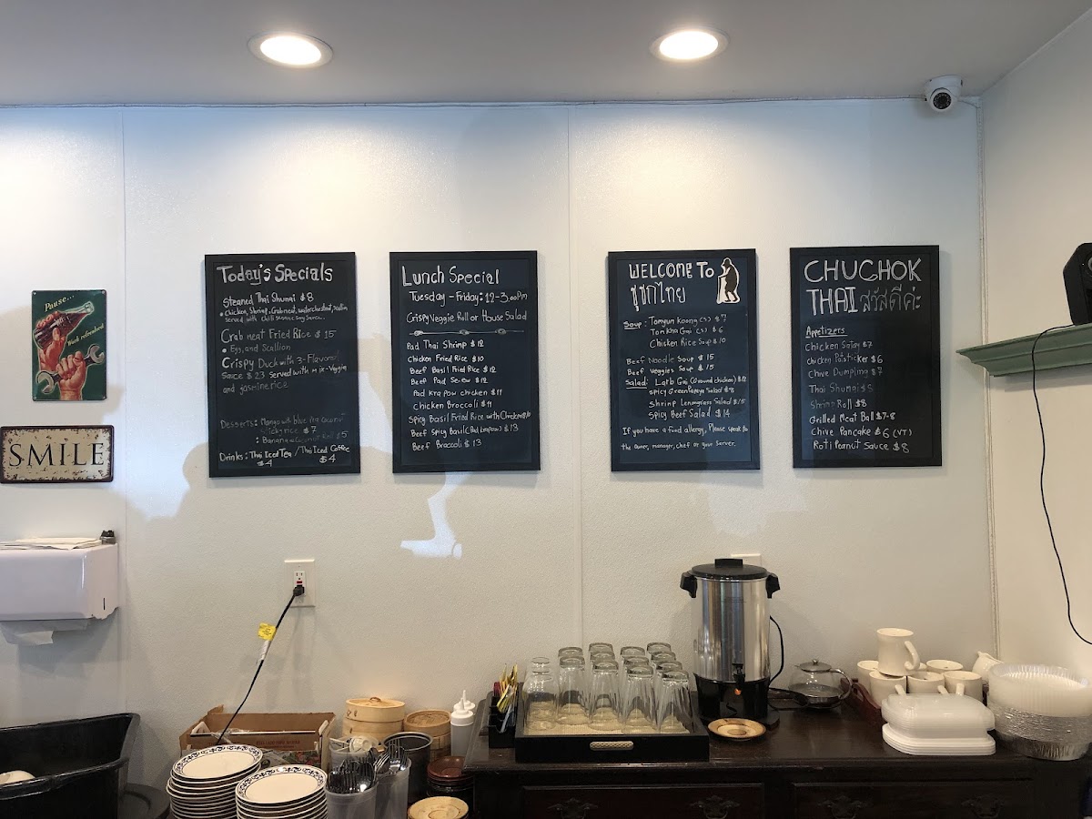 From a reviewer’s perspective, Chuchok Thai presents a focused and flavorful menu that highlights classic Thai favorites with clear price points where available. The menu opens with simple starters such as Chive Dumpling, setting the tone for comforting Thai fare. Among the mains, the standout rice and noodle dishes include Crab Meat Fried Rice, Pad Thai Shrimp, and Chicken Fried Rice, each bringing familiar Thai flavors to the forefront. Heartier options like Beef Basil Fried Rice showcase savory basil notes, while the more indulgent Crispy Duck With 3‑Flavored Sauce hints at a balance of sweet, sour, and spicy elements that elevate the dish. Although not all items list prices in the provided information, the ones that do suggest approachable pricing, with similar mains often falling in the low‑to‑mid‑$20 range according to broader menu listings. Overall, the menu reads as a well‑curated selection of beloved Thai staples, balancing noodles, fried rice, and rich protein dishes in a way that should satisfy both newcomers and fans of authentic Thai cuisine.
